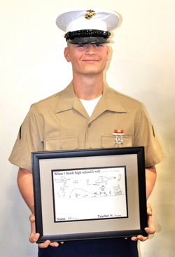 "Alston enjoys working out, hiking, hunting, and serving in his church and community. His athletic abilities developed through his school days with baseball, football, wrestling and tennis, as well as his determination to succeed, and saw him through "THE CRUCIBLE." Alston has wanted to be a Marine since he was very young - the photo with him holding the pencil drawn photo of what he wanted to do when he finished high school was given to me by his 3nd grade student teacher from the first day of school that year. I had it framed and gave it to him as one of his boot camp graduation presents (talk about a tear jerker for all the MoM's sitting nearby at graduation)!"