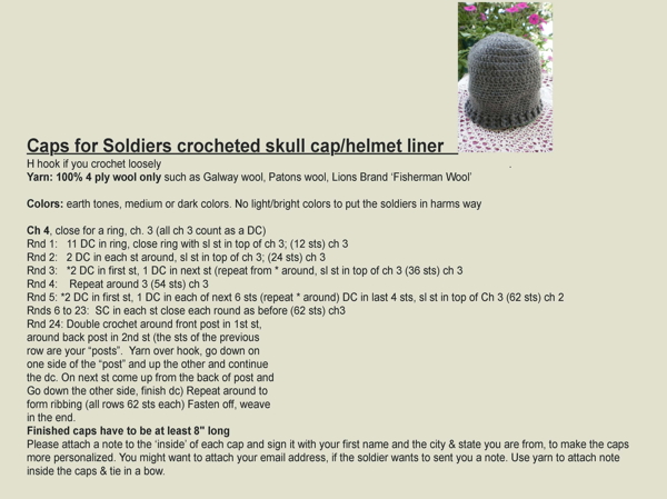 Our deployed Troops really can use some warm head gear! Knitters and Crocheters are needed to create these special Helmet Beanies. I hope you'll consider supporting this project and feel free to share it with others!