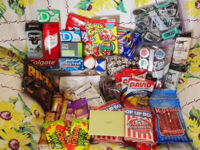 Gummy Bears, Hershey Bars, Reese’s Cups, Gatorade (individual drink packets that you add to water), chocolate and peanut butter cookies, Scotcharoos, Chocolate Chip Muffins, Funyuns by Frito Lay.