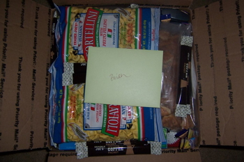 Update 8-30-12: News from Brian just arrived! He writes, "Hey Cindy! we've received so many boxes it's crazy haha! It has been awesome though and everyone here appreciates it so much I wish you could have seen how happy they were when I put about 20 boxes in the rec center for everyone to go through!! Everything came out in great condition the only item we had to throw away was some baked cake/bread. It was in the sun too long and had some mold when we opened it up. Everything else though came out great. I can't thank you and the whole bakinggals team enough for everything they have sent. It is so amazing to hear from people that truly support the troops! It is such a boost in morale for everyone when care packages come in especially when we sare in such an isolated place. You all make these deployments so much more pleasant!!"