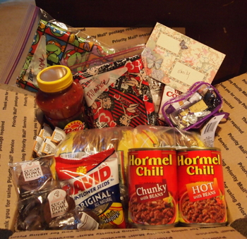 From Angel Peggy...lots of spicy snacks for our Troops! And some cute pillowcases to rest their heads. Thank you, Peggy!